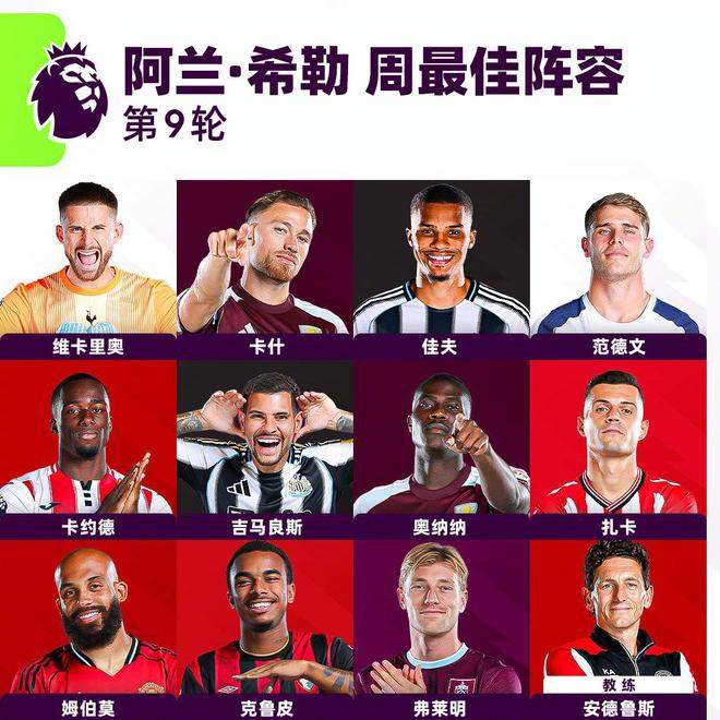 雷速体育10月28日讯 英超第9轮上周末结束,阿兰·希勒评选本轮最佳11人阵容,曼联球员姆伯莫双响入选,卡什、扎卡在列。
